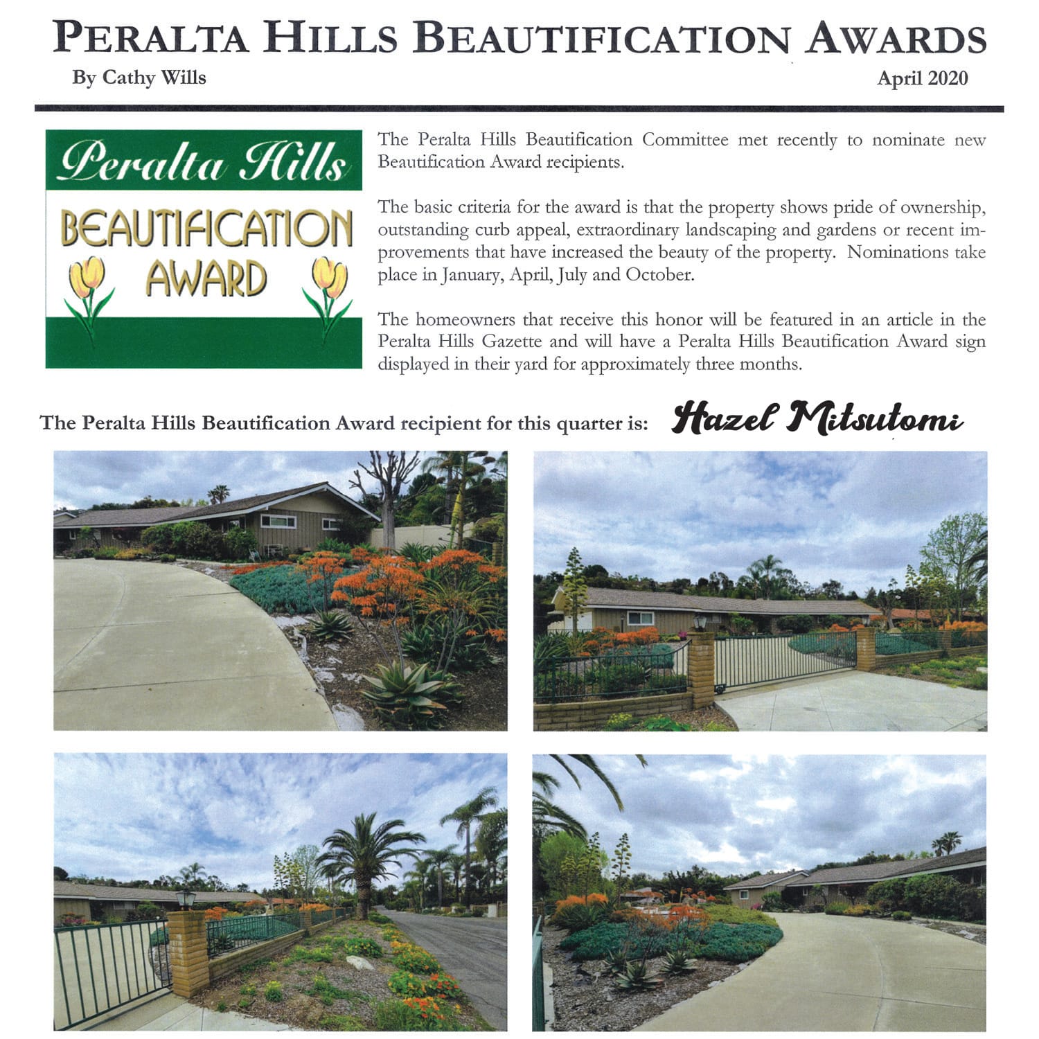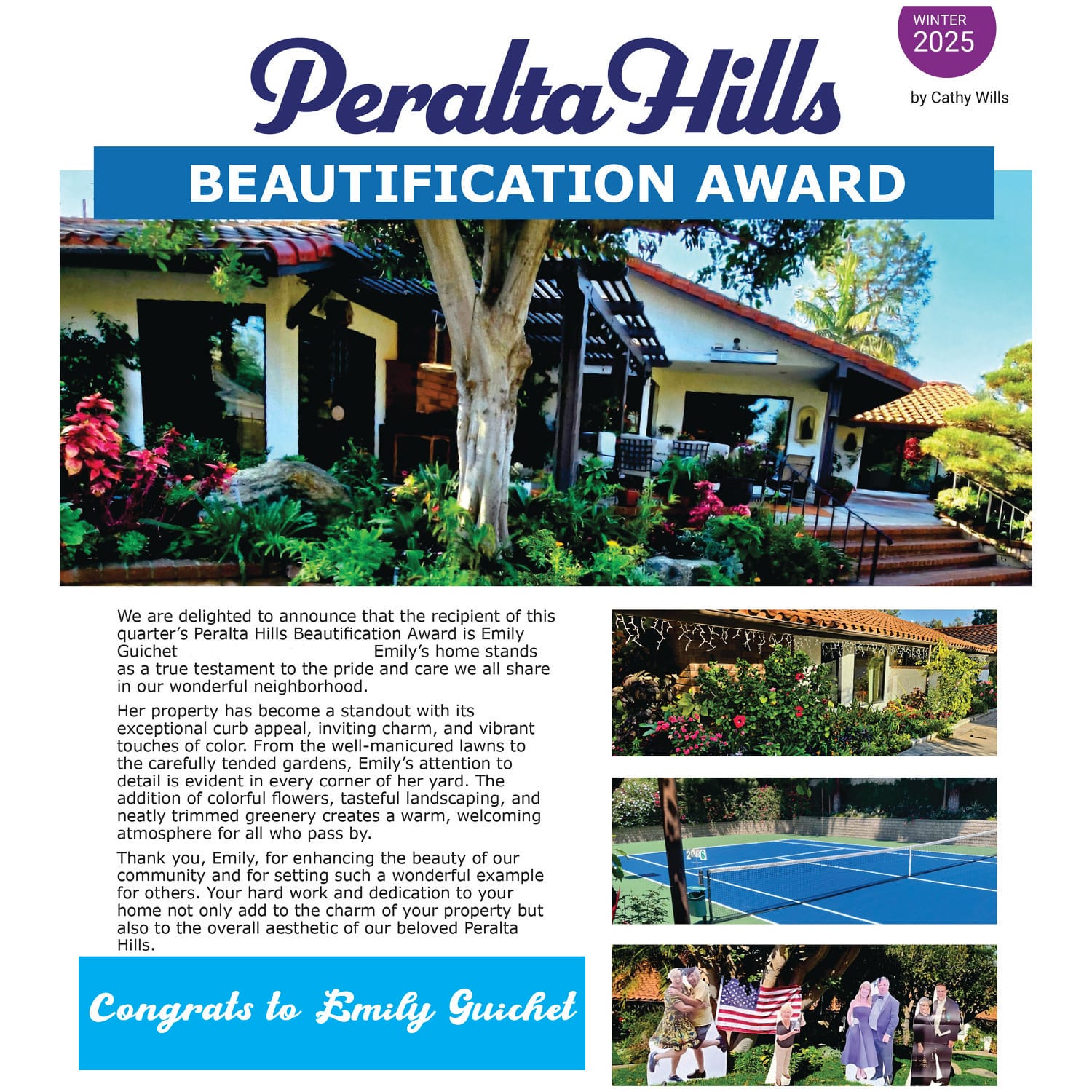 Each award recipient is acknowledged in our quarterly newsletter, The Gazette, serving as a shining example of the collective efforts that make our community so special. We encourage all neighbors to continue nurturing their homes and yards, for it is your passion and care that enriches the beauty and spirit of Peralta Hills.