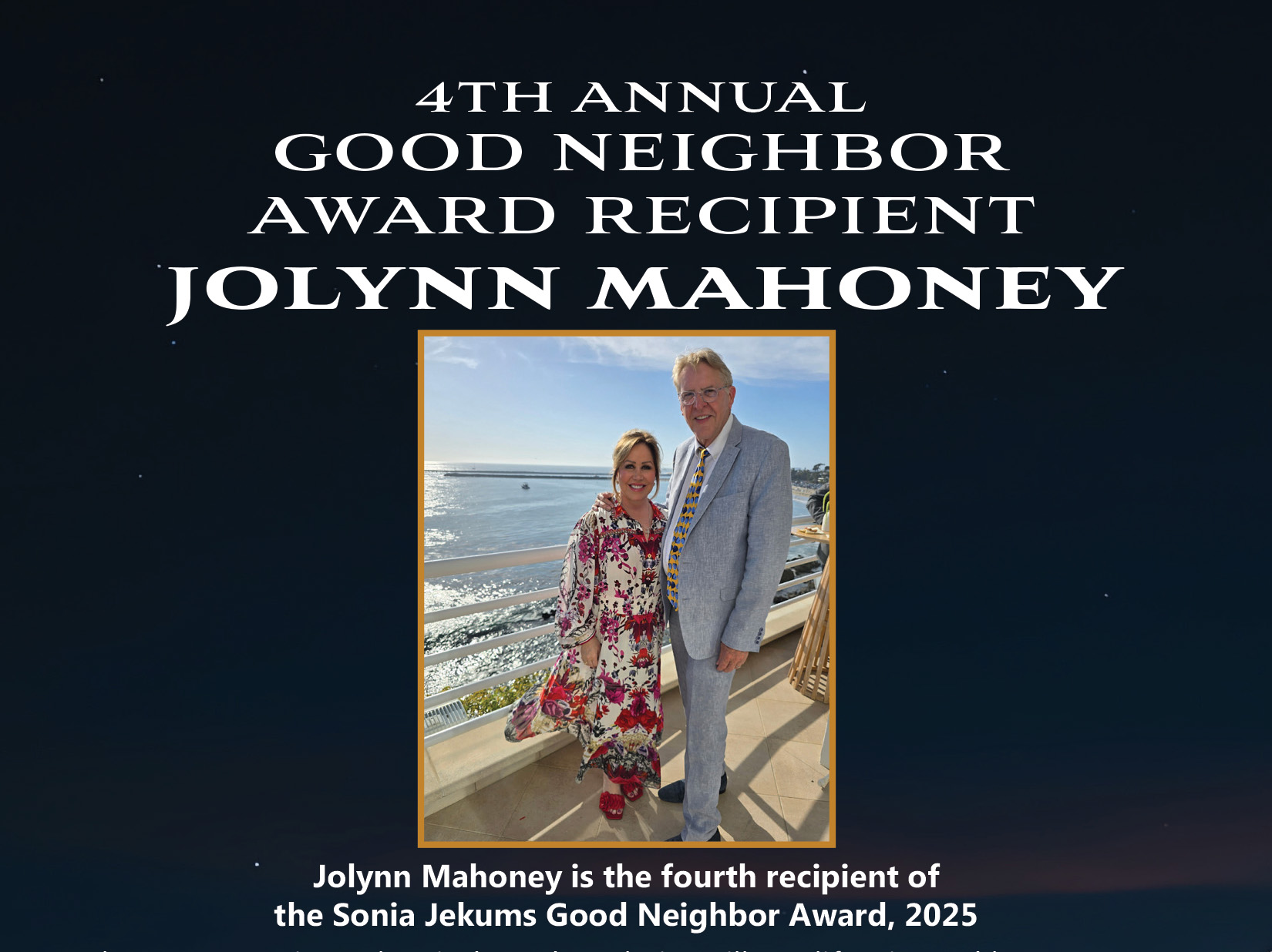 In 2022, we established The Annual Good Neighbor Award in honor of the late, Sonia Jekums—a beloved Past President of Peralta Hills, who was a dedicated 44-year resident. This prestigious award recognizes a Peralta Hills Estate homeowner who exemplifies leadership in our community through acts of selfless service and active participation in neighborhood activities and events.